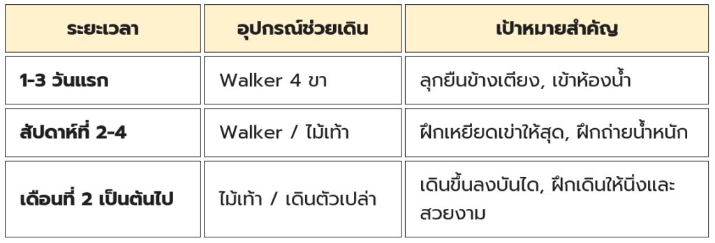 ช่วงนี้แผลผ่าตัดยังใหม่ และมีความเจ็บปวดอยู่บ้าง เป้าหมายคือการ “ลดบวม” และ “ฝึกเดินด้วยอุปกรณ์ช่วยพยุง”